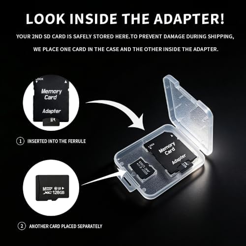 - 🔌 [Complete Accessory Kit – Plug & Play] Includes 2 × 128GB MicroSDXC cards, 1 SD adapter, and 1 USB card reader. Easily transfer files between cameras, phones, and computers without extra accessories.