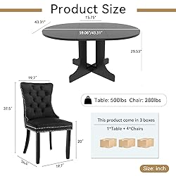 【5 Piece Extendable Dining Table Set】This magic dining set comfortably seats 2-6 guests, which includes a extendable oval dining table and 4 chairs.The black wood tabletop and trestle base make dining table a versatile addition to the kitchen, dormitory, living room, study room, office and meeting room. 【Outstanding Expandable Design】The expandable function of the dining table set is highly practical, extending up to 59.04 inches at its maximum.It allows for flexible adjustment according to the number of diners.When having meals with family members, you can retract the table to save space.When entertaining relatives and friends, simply expand it to seat more people, ensuring convenient usage. 【Durable Kitchen Table Set for 4】The oval dining table set is made of high-quality MDF with sturdy legs, designed for stability and long-lasting durability, ensuring reliable use for years.Whether for family meals or weekend gatherings with friends, this extentable dining room table set is the perfect choice. 【Ergonomic & Comfortable Dining Chairs Set 】The unique dining chair is made of high-quality velvet which is breathable, elegant and comfortable. The backrest is designed according to the curvature of ergonomics, which is comfortable and adds a touch of sophistication to the chair. The durable solid wood legs make this chair stand out and look classy. 【Easy to Assemble and Satisfied Customer Service】 All screws, tools, and manuals are included.Easy installation within 20 minutes.The table set are separately packaged in 3 packages.We provide replacement repairing,24 hrs customer service.