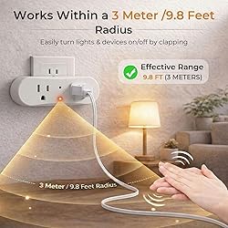 Hands-free Sound Control: turn lights or small appliances on and off simply by clapping your hands -2 claps to turn on, 3 claps to turn off; This clapper light control Ideal for everyday use in bedrooms, living rooms, or offices Dual Outlet Design: Our clap-on, clap-off light switch features 2 power sockets, allowing you to control two devices simultaneously. Each outlet responds to clap commands within a range of up to 3 meters/118 inches, making it perfect for managing lamps, fans, or decorations effortlessly. Plug-and-Play Convenience: No wiring, Wi-Fi, or tools required. Just plug into any standard wall outlet and start using immediately. the clap on clap off lights ideal for hard-to-reach lamps, bedside lights—especially helpful for seniors, kids, or people with limited mobility Safe & Reliable Performance: this clapper outlet plug rated 110–220V (max 1200W, 1.6A). Compatible with low-power home devices such as lamps, humidifiers, or lighted displays. Not suitable for heavy-duty appliances Versatile Use: Whether you're in the bedroom, office, or dorm room, this clap-controlled plug provides effortless control for your lamps, fans, and other small electronics. It’s also ideal for people with limited mobility, seniors, or children who need simple, easy-to-use solutions Note: If the environment produces high-frequency vibration with rhythmic sound, the switch will be mistaken for applause. Re-clapping the hand control switch can be used.