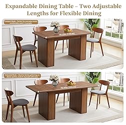 【Versatile Expandable Rectangle Design】This expandable dining table transforms from a 55-inch rectangular table for 4–6 people into a spacious 71-inch table for up to 8 guests. A smooth pull-out mechanism and removable leaf make it easy to switch between compact everyday use and larger gatherings. 【Elegant Carved-Line Base】Featuring a refined carved line pedestal base, this table combines geometric modernity with subtle craftsmanship. Its symmetrical lines and solid profile bring an architectural charm that elevates any dining room or workspace. 【Durable and Water-Resistant Surface】Crafted from premium engineered wood, the tabletop features a durable MDF core and a resin-coated surface that resists scratches, stains, and water. Just a quick wipe keeps it looking sleek and spotless after every meal. 【Perfect for Any Occasion】Whether hosting family dinners, weekend brunches, or team meetings, this extendable table adapts to your needs with ease. Its generous surface accommodates 4 to 6 seats comfortably, making it ideal for both dining and multifunctional use. 【Sturdy and Easy to Assemble】Dimensions: 55.12"L × 31.5"W × 29.53"H (compact) / 70.87"L × 31.5"W × 29.53"H (extended). Weighing 91.93 lbs with a 132 lbs total weight capacity, this table ensures solid stability. Simple instructions allow for quick and effortless setup.