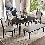 1. EXCELLENT CRAFTSMANSHIP AND COMFORT - The attention to detail in this set of six dining table and chairs is reflected in the soft and comfortable upholstered chairs with beautiful rivet accents on the backs. All four high-back upholstered table and chairs have curved backrests that provide excellent back support for comfort during long gatherings. If there is any problem, please visit our website Merax.com or contact us via this email: [email protected] 2. ELEGANT DINING TABLE SET - Enjoy high-end elegance with this 6-person solid wood dining table set that seats 6. The rectangular table top is meticulously turned and finished in gold, exuding sophistication and elegance 3. COMPLETE 6-PIECE SET WITH BENCH AND CHAIRS - With 4 upholstered chairs and a bench, this 6-person dining set is perfect for hosting dinner parties with friends or enjoying everyday meals with family, making it an essential dining set for your home 4. STURDY AND RELIABLE - The table top of the 6-person dining set is made of a combination of MDF and Pinewood veneer for stability and durability in everyday use, and the legs of the 6-person dining set are made of rubberwood to extend the life of the set. With a weight capacity of 250 lbs for the table and benches, and 200 lbs for the chairs, the 6-person dining set gives you peace of mind 5. EASY ASSEMBLY - The dining set is designed with user convenience in mind, making the assembly process stress-free. We provide all the necessary tools and clear instructions to ensure a smooth installation of the dining table and chairs