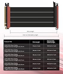 Verified Compatibility — Built for vertical GPU mount and standard layouts across towers, SFF/ITX sandwich cases, open benches, and water-cooled rigs. Fully backward-compatible with PCIe 4.0 and validated on ASUS WS WRX80SE WiFi II and WRX90E Gen5 boards. Ready for next-gen cards like RTX 5090 and RX 9070. Use this PCIe 5.0 riser cable to place the GPU exactly where airflow and aesthetics demand—without giving up stability. Gen5 x16 Performance & Shielding — Delivers full 128GB/s on PCIe 5.0 x16 with tuned impedance, premium conductors, and multilayer shielding to suppress crosstalk and EMI. The AVA design targets clean eye margins under load and tight bends, making it a dependable PCIe Gen5 riser cable for high-FPS gaming, AI, and storage workflows. Replace Gen 3 and Gen 4 PCIe cables while preserving upgrade headroom for future GPUs. Showcase Aesthetics, Improve Cooling — Move the card where it breathes. A vertical mount GPU clears intake for thick shrouds & radiators, reducing heat soak & noise while giving builds a clean, gallery-style look. Route like a tidy GPU extension cable & keep clocks steady thanks to robust shielding & low-loss geometry. Builders report good quality & that it simply works great when paired with the right bracket and case layout. View Product Description to ensure Compatibility with your PC case. Installation Instructions — Measure with a string from the motherboard slot to the GPU PCB to pick the correct span. Seat connectors fully until latched; Fold & Flex in any way. Use standoffs and support brackets if the chassis requires it. If fit seems tight, contact us before forcing parts—we’ll advise the best path for your case model. Clear guidance turns this into a straightforward PCIe cable install, even in cramped ITX routes. Choose the right Cable — Choose a length between 2–35.4 inches (see Installation Instruction) and the connector you need: right angle, straight, left angle, double reverse, single reverse right, single reverse left, or single reverse straight. One family covers ITX sandwiches, server trays, and vertical displays. Consistent Gen5 signal integrity across sizes makes it a flexible PCIe extender or GPU riser cable for clean cable management today with room to evolve tomorrow.