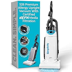 - Experience powerful, reliable cleaning with the Premium Allergy Upright Vacuum Cleaner, engineered for deep reach, advanced filtration, and lasting performance. Built for whole-home versatility, the Simplicity Upright delivers steady suction and user-friendly operation across every surface. With an 11-foot total reach, the metal extension wand, deluxe vinyl stretch hose, and precision tools make it easy to clean vents, ceilings, and corners. The durable wand is designed for strength and control, giving users firm reach where extra stability matters. A 30-foot power cord lets you move freely through large areas without frequent unplugging, while ergonomic handling helps reduce strain during extended cleaning sessions. Switch effortlessly between carpet and hard floors/above the floor cleaning using the Carpet & Floor Selector button, which controls the brushroll for optimized performance on different surfaces. The self-adjusting nozzle automatically adapts to floor height, maintaining strong suction without manual settings. Engineered for longevity, this Bagged Upright features a lifetime belt and jam sensor system that pauses operation if the brushroll becomes obstructed—protecting internal components and extending the vacuum’s lifespan. Rubber wheels and a translucent furniture guard safeguard walls and baseboards while maneuvering. The Premium Allergy Upright S26 includes a HEPA media bag, pleated HEPA post-filter, and a secondary electrostatic layer to capture fine particles, promoting cleaner indoor air as you vacuum. Included tools—a dusting brush, upholstery attachment, crevice tool, and metal extension wand—support full-house coverage from floor to ceiling. Dependable and thoughtfully designed, the S26 Upright ensures consistent cleaning performance and durability for everyday use.