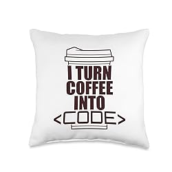 I TURN COFFEE INTO CODE. If you're a professional front-end, backend, full-stack, software, or UI/UX developer, you know how easy it is to obsess over codes and programming languages. Fun meme for your favorite developer who codes all day! Stay caffeinated! Fun for a computer programmer, coder, anyone into web development. Click on the brand name for more funny coding memes. 100% spun-polyester fabric Double-sided print Filled with 100% polyester and sewn closed Individually cut and sewn by hand Spot clean/dry clean only