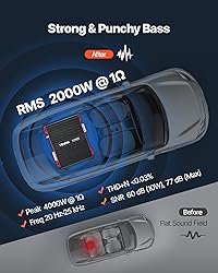 2000W RMS Power: Authority in Jaw-Dropping Bass. The Class D monoblock car amplifier delivers 2000W RMS at 1Ω. It's a true bass engine that effortlessly drives multiple subwoofers, delivering a balanced and powerful flood of bass Wide Compatibility: This car audio amplifier works with most factory car audio systems of sedans and pickups. It supports 1/2/4Ω impedance and is ideal for high-power 12-inch or 15-inch subwoofers, or large systems with multiple subs. DIY setup is easy Real-Time Volume Control: The monoblock amplifier's controller has a 16.4 ft cable, allowing you to adjust the bass volume strength from the driver's seat. The panel includes low pass filter, bass boost, and input sensitivity for pre-drive customization Compact Design: Ideal for compact vehicles and tight spaces, the compact size of this car mono amplifier allows for flexible installation behind the rear seat or in the trunk Cooling & Protection: The car amplifier's aluminum alloy chassis and built-in fan provide efficient heat dissipation for stable long-term high-power output. The temperature, overcurrent, and overvoltage protection with real-time feedback ensures safe use