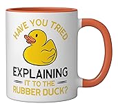Programming Debugging Tool design. If you use a Rubber Duck for debugging your code, this Have you tried to explain it to the Rubber Duck Design perfect for you! Everyone knows it,Everybody writes bugs and sometimes a Programming Duck can help you to fix problems. This funny rubber duckie Design is ideal for Programmers, Developer, Software-Developer, Coder, Nerds, Rubber Duck, geeks Collectors, Dad and Mothers. 11-ounce ceramic mug is dishwasher and microwave-safe, lead and BPA free Features glossy finish with accent colors on interior, handle, and rim of two-tone designs