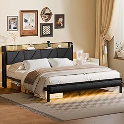 【Storage Headboard with Charging Station】: This bed frame king size built -in 2 standard power outlet & 2 USB Ports, it is very convenient for you to charge your electronics and use light to read within easy reach. 3.9’’ wide storage headboard provides you with extra place to store phone, photo, glasses, clock and books within easy reach. 【Smart RGB LED and Mesh Headboard 】:Multifunctional LED lights strips, beautiful 29 RGB LED Light colors (There are over 60000 colors to choose from),Mobile App +Remote Control multiple control modes. You can freely set the brightness, color, mode and timing functions to create various scenes. The unique metal mesh headboard make the atmosphere more live 【Headboard and Footboard】:Gray upholstered headboard with breathable and wear resistant linen fabric add a unique feeling that makes your bed not only comfortable but also more creative. Rustic brown board and grey backrest, the design of headboard and footboard complements a variety of decor styles and keeps your mattress in place, suitable the mattress/mattress box spring max 8-14 inch in height 【Sturdy Stable and Noise Free】:KING size bed made of sturdy metal structure with 13 heavy-duty metal slats and 14 support legs, which enhance the stability and durability of the platform bed. Weight capacity 1000lbs +. A memory foam strip pastes the center bar will prevent noise from metal-on-metal rubbing. 【Under-Bed Storage】: This platform bed frame with headboard has 12.5” under-bed storage space, with plenty space to hold your belongings, like luggage, organizers etc, and it’s easy to clean under-bed space without dust remaining. 【Minimalist design and easy assemble 】 :Industrial Bed frame with rustic look of its iron and kiln-dried engineered wood construction . Complete instructions book and labeled pieces , you can easily complete it the age between 10 and 70 years old. If you have further questions, Furnulem team is always online to assist.