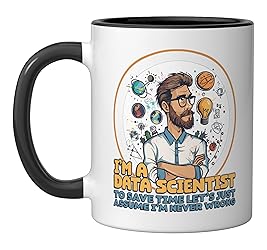 Funny saying for data scientists and data analysts who love analyzing data. Great artificial intelligence data science motif. I'm A Data Scientist To Save Time Let's Just Assume I'm Never Wrong. 11-ounce ceramic mug is dishwasher and microwave-safe, lead and BPA free Features glossy finish with accent colors on interior, handle, and rim of two-tone designs