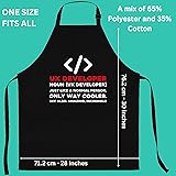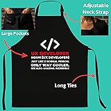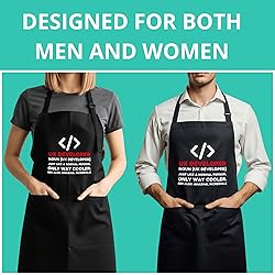 - Turn your kitchen into the ultimate compilation station with this Programmer Apron, dedicated to coders, developers, and software engineers who know that cooking is just an algorithm with edible output. This design celebrates the coding lifestyle and serves as the perfect gear to protect you from runtime errors like sauce splatters and oil spills while you debug your dinner recipes. Made from comfortable and durable cotton polyester, it features an adjustable fit suitable for long coding marathons or weekend BBQ sessions, making it the perfect techie gift for Python experts, Java masters, or full-stack developers so they can execute their favorite meals with zero bugs and maximum flavor.