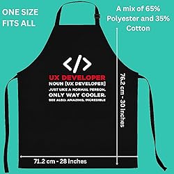 STURDY POLY-COTTON BLEND: Stay protected with a durable poly-cotton material. It's built for daily use and is machine washable. FITS EVERYONE COMFORTABLY: One size fits most. The adjustable neck and long ties ensure it fits securely and comfortably. This Funny Ux Developer Apron / Design is the perfect Christmas or Birthday Gift for Men and Women. Ux Developer for Men or Women. Ux Developer Gift Ideas. POCKETS FOR CONVENIENCE: Store your necessities in the two big pockets, perfect for recipes, timers, or utensils.