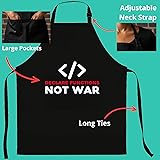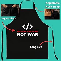 A FIT FOR EVERYONE: With an adjustable neck and long ties, it fits most body types for men and women. DURABLE POLY-COTTON: This apron's poly-cotton fabric is tough on stains and simple to wash. Declare Functions Not War Coding Apron. Great Funny Coding Apron. Makes A Great Gift For A PHP, C++ Or Java Developer! Declare Functions Not War Coding Apron Apron POCKETS FOR CONVENIENCE: Keep items you need in the two conveniently placed front pockets.
