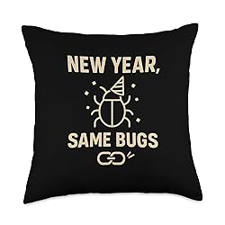 Funny apparel for the frustrated Programmer or Software Developer. A hilarious statement capturing the reality of Coding and persistent Bugs in the New Year. Perfect for Engineers who spend their days fixing code. This witty product is a must-have for workplace humor and tech meetups. Great wardrobe addition for January and beyond. 100% spun-polyester fabric Double-sided print Filled with 100% polyester and sewn closed Individually cut and sewn by hand Spot clean/dry clean only