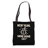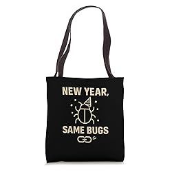 Funny apparel for the frustrated Programmer or Software Developer. A hilarious statement capturing the reality of Coding and persistent Bugs in the New Year. Perfect for Engineers who spend their days fixing code. This witty product is a must-have for workplace humor and tech meetups. Great wardrobe addition for January and beyond. 16” x 16” bag with two 14” long and 1” wide black cotton webbing strap handles. Made of a lightweight, spun polyester canvas-like fabric. All seams and stress points are double-stitched for durability, and the reinforced bottom flattens to fit more items and hold larger objects. Spot clean/dry clean only.