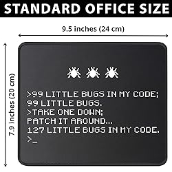ULTRA-SMOOTH SURFACE: Optimized fine-weave texture ensures pixel-perfect tracking and responsive control for all optical and laser mice. Perfect for Gaming and high-precision tasks. NON-SLIP & STABLE: Heavy-grip, textured rubber base prevents unwanted movement, keeping the mouse pad firmly secured on your desk for maximum control. 99 little bugs my code, take one down, patch it around, 127 little bugs my code mousemat whether you love debugging, developing, programming or coding this 99 little bugs my code themed mousepad mouse pad is what you are looking for. Perfect for your so, friends and relatives who loves mousemat to code mousepads WATERPROOF & DURABLE: Features anti-fray stitched edges and a spill-resistant coating for easy cleanup and long-term durability. A reliable desk mat built to last.