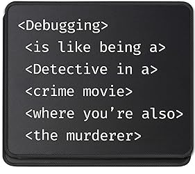 ULTRA-SMOOTH SURFACE: Optimized fine-weave texture ensures pixel-perfect tracking and responsive control for all optical and laser mice. Perfect for Gaming and high-precision tasks. NON-SLIP & STABLE: Heavy-grip, textured rubber base prevents unwanted movement, keeping the mouse pad firmly secured on your desk for maximum control. This funny programmer coding design reads debugging is like being detective crime movie where you' also the murderer. The computer science software mousemat & web developer design mousemat Programmer coding debugging being mouse pad detective crime movie mousepad mousepad WATERPROOF & DURABLE: Features anti-fray stitched edges and a spill-resistant coating for easy cleanup and long-term durability. A reliable desk mat built to last.