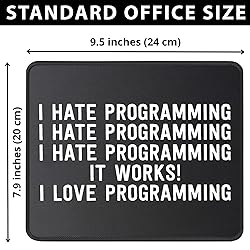 - Code in comfort and style with this programmer-themed mouse pad, the ideal desk accessory for the software developer, web designer, or IT professional. Enjoy syntax-smooth gliding and pixel-perfect accuracy from the micro-textured cloth surface, optimized for all mouse sensors from laser to optical. This mousepad stays put (no 404 errors here) thanks to a heavy-duty, non-slip rubber base that grips your desk firmly. Built to last through countless deployments and coffee-fueled all-nighters, it features robust anti-fray stitched edges and a waterproof, easy-to-clean surface, making it the perfect tech gift for any computer science pro or coding enthusiast.