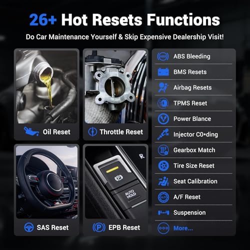 - 【26+ Essential Reset & Relearn Functions – Everyday Maintenance Made Easy】Handle common maintenance and repair jobs without visiting the shop. The D200 code readers & scan tools includes 26+ high-demand reset functions, including Oil Reset, EPB Service, Crank Relearn, BMS Battery Registration, SAS Calibration, ABS Brake Bleeding, Throttle Relearn, Injector Coding, Crankshaft Sensor Relearn, Headlight Adjustment, Tire Size Reset, and more. Covers most daily service needs across American, European, and Asian vehicles. Note: Service functions vary by vehicle—please confirm compatibility before purchase— support @ vdiagtool. com.