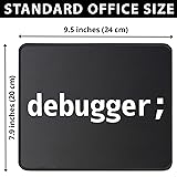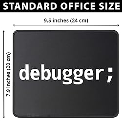 Material: Non-slip rubber base keeps the pad in place. 7.75" x 9.25" x 0.12" (3mm) Surface: Cloth texture compatible with optical and laser mice. Computer programmers and software developers who write javascript code use the "debugger;" statement to breakpoint to stop program execution at the point, where it occurs the code. Show your love for web development & js with this simple design mousemat mousepad Design for javascript coders showing the text "debugger;" narrow monospace font. Work, mousemat tech conferences and other events where javascript & nerds meet mousepads Durability: Stitched edges prevent fraying and peeling.