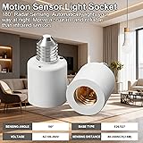 Note: This motion-sensing light socket has an effective detection range of 10 to 20 feet, depending on the environment. It uses radar sensing technology, which can detect motion through walls. Therefore, it is not suitable for small or partitioned spaces, as it may detect movement even through walls. It is recommended for use in larger, open areas Radar Motion Detection: This screw-in motion sensor light socket is equipped with a high-sensitivity radar sensor, capable of 360° human motion detection. It automatically turns the light on and off, offering higher accuracy and stronger anti-interference capabilities compared to traditional infrared sensors Detection Range: The screw-in motion sensor socket has a detection range of 10 to 20 feet (approximately 3 meters to 6 meters), capable of penetrating walls to detect motion signals, making it suitable for large spaces. Note: In smaller spaces, continuous motion detection may occur, causing the light to remain on Energy Efficient and Eco-Friendly: This smart motion sensor socket automatically turns on the light when motion is detected under low light conditions, and delays turning off for 15-30 seconds when no motion is detected, saving up to 80% energy. It’s ideal for use in entrances, hallways, staircases, and warehouses Smart Adjustment, Enhanced Safety: The smart light sensor socket automatically lights up and turns off in the dark, reducing the risk of falls or collisions in low-light conditions. At night, the intelligent light sensor socket can detect unusual motion and activate the light to deter suspicious activity. Perfect for garages, fences, and basements Plug and Play: Easily screw into a standard E26/E27 socket without rewiring. The auto on/off motion sensor lamp holder adapter is compatible with various bulbs, including LED and energy-saving bulbs, supporting up to 60W power with an AC voltage range of 100V–240V. Note: Do not use bulbs exceeding 60W; for high-heat bulbs (e.g., halogen bulbs), do not exceed 30W Quality Assurance: This product has a factory defect rate of approximately 5%, which is considered normal in the industry. If the motion sensor light socket malfunctions, please contact us for assistance — we will respond within 24 hours.