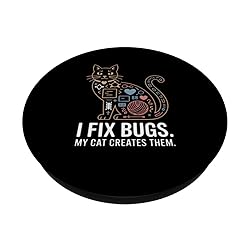 Show your software developer humor with this I Fix Bugs My Cat Creates Them coding cat theme, ideal if you spend nights debugging while your mischievous kitty walks over the keyboard and breaks code. Great for programmers, coders, testers and sysadmins who love cats, perfect when you join hackathons, pair programming, standups or late sprint nights and want to share a playful inside joke about bugs. Adhesive backing attaches the PopGrip to your case or device. Will not stick to silicone,leather,waterproof,or highly textured cases. Works best with smooth,hard,plastic cases. Not compatible with wireless charging Printed top is swappable with other compatible PopGrip models. Just press flat,turn 90 degrees until you hear a click and remove to swap.