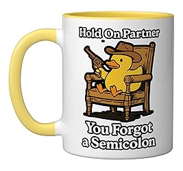 Funny cowboy rubber duck saying hold on partner you forgot a semicolon. Perfect for programmers, coders, and software developers who enjoy a humorous take on debugging, coding, and tech life. A fun way to show passion for technology and computer science. Great for anyone in the tech world, whether engineers, students, or IT professionals who appreciate clever designs that highlight coding humor and spark conversation. 11-ounce ceramic mug is dishwasher and microwave-safe, lead and BPA free Features glossy finish with accent colors on interior, handle, and rim of two-tone designs