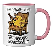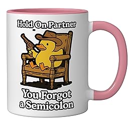 Funny cowboy rubber duck saying hold on partner you forgot a semicolon. Perfect for programmers, coders, and software developers who enjoy a humorous take on debugging, coding, and tech life. A fun way to show passion for technology and computer science. Great for anyone in the tech world, whether engineers, students, or IT professionals who appreciate clever designs that highlight coding humor and spark conversation. 11-ounce ceramic mug is dishwasher and microwave-safe, lead and BPA free Features glossy finish with accent colors on interior, handle, and rim of two-tone designs