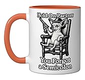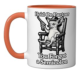 Funny cowboy chihuahua saying Hold on partner, you forgot a semicolon. Perfect for programmers, coders, and software developers who enjoy a humorous take on debugging, coding, and tech life. A fun way to show passion for technology and computer science. Great for anyone in the tech world, whether engineers, students, or IT professionals who appreciate clever designs that highlight coding humor and spark conversation. 11-ounce ceramic mug is dishwasher and microwave-safe, lead and BPA free Features glossy finish with accent colors on interior, handle, and rim of two-tone designs