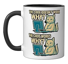 Coding doesn't work, why? Coding works, why? Perfect for programmers, coders, and software developers who enjoy a humorous take on debugging, coding, and tech life. A fun way to show passion for technology and computer science. Great for anyone in the tech world, whether engineers, students, or IT professionals who appreciate clever designs that highlight coding humor and spark conversation. 11-ounce ceramic mug is dishwasher and microwave-safe, lead and BPA free Features glossy finish with accent colors on interior, handle, and rim of two-tone designs
