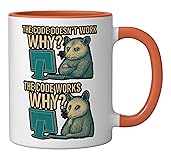 Coding doesn't work, why? Coding works, why? Perfect for programmers, coders, and software developers who enjoy a humorous take on debugging, coding, and tech life. A fun way to show passion for technology and computer science. Great for anyone in the tech world, whether engineers, students, or IT professionals who appreciate clever designs that highlight coding humor and spark conversation. 11-ounce ceramic mug is dishwasher and microwave-safe, lead and BPA free Features glossy finish with accent colors on interior, handle, and rim of two-tone designs