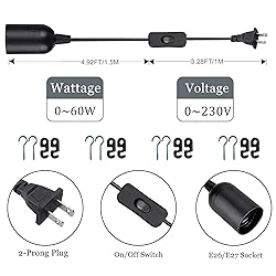 - The Zarnicy light socket plug is crafted from durable, heat-resistant PVC and UL certified for safety.light bulb plug in cord features a 8.2FT length, an easy-to-use ON/OFF switch, and is compatible with standard E26/E27 bulbs (up to 60W) with a 2-prong US AC plug. Ideal for DIY pendant lighting projects, the extension cord with switch comes with ceiling hooks, cord hooks, and socket rings, allowing for easy installation and customization. The pendant light plug in cord is Perfect for creating ambiance in various decor styles. We’re committed to your satisfaction with fast response times and prompt replacement if needed.