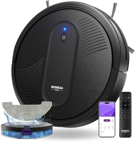 MONSGA Robot Vacuums and mop, Powerful Suction Robotic Vacuum, 140Min Runtime, Ideal for Hard Floor, Low Pile Carpet, Pet Hair, Remote/App/Voice Control, Schedule Clean (Black)