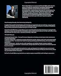- Oracle Powerful DBA Tools – Script Library: Automate, Monitor, and Optimize Your DatabaseUnlock the power of automation and take control of your Oracle database environment with this comprehensive collection of expert-crafted DBA scripts.Oracle Powerful DBA Tools – Script Library is the definitive resource for database administrators seeking to streamline operations, enhance performance, and ensure reliability. Written by seasoned Oracle DBA Pierre Montbleau, this book provides ready-to-use, production-tested SQL and PL/SQL scripts that transform complex, time-consuming tasks into automated, repeatable processes.What’s Inside:This practical guide equips you with tools across every critical area of database administration:Performance & Diagnostics: Dive deep with the AWR Performance Analyzer, conduct comprehensive health checks, and perform advanced SQL tuning and workload analysis.Proactive Monitoring & Alerting: Implement real-time monitoring systems for database health, storage, sessions, and performance metrics with automated notifications.Backup, Recovery & Disaster Recovery: Ensure data protection with robust backup monitoring, validation scripts, and full disaster recovery planning utilities.Automation & Scheduling: Build a self-healing automation framework to schedule routine maintenance, reporting, and cleanup tasks, freeing you for strategic work.Capacity Planning & Forecasting: Move from reactive firefighting to proactive management with tools that analyze current usage and forecast future growth for informed scaling decisions.Security & Compliance: Harden your database security posture with audit scripts, compliance assessments, and user management utilities.Cloud Migration & Strategy: Systematically assess your database's cloud readiness, estimate migration effort and cost, and plan your journey to AWS, Azure, OCI, or Google Cloud.Why This Book is Essential:Born from Real-World Experience: Every script solves actual operational challenges faced by DBAs in the field.Immediate Practical Value: Copy, adapt, and deploy scripts directly to your environment. Each includes clear explanations of architecture, usage, and interpretation.From Routine to Strategic: Covers the full spectrum—from daily checks (tablespace usage, active sessions) to strategic projects (cloud migration, capacity planning).Promotes Best Practices: Encourages a culture of automation, proactive monitoring, and data-driven decision-making.Whether you're a novice DBA looking to automate your first tasks or a seasoned professional implementing enterprise-grade monitoring and automation, this library provides the practical, reliable tools you need to build smarter, more resilient, and efficient database systems.Stop managing manually. Start automating intelligently.