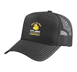 Programming Debugging Tool design. If you use a Rubber Duck for debugging your code, this Have you tried to explain it to the Rubber Duck Design perfect for you! Everyone knows it,Everybody writes bugs and sometimes a Programming Duck can help you to fix problems. This funny rubber duckie Design is ideal for Programmers, Developer, Software-Developer, Coder, Nerds, Rubber Duck, geeks Collectors, Dad and Mothers. Five-panel trucker hat featuring structured foam front, mesh back, and high-profile crown Adjustable fit; one size fits most adults