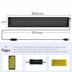 - Bring dynamic and customizable lighting to your space with this Programmable LED Scrolling Sign. Featuring a flexible LED panel and Bluetooth App control, it allows you to easily create scrolling text, patterns, and animated effects directly from your smartphone. Powered by USB 5V, the display is energy-efficient, easy to install, and suitable for car interiors, store windows, bars, and promotional displays. The 38x 6 inch size delivers clear visibility while adapting to flat or curved surfaces for versatile use.