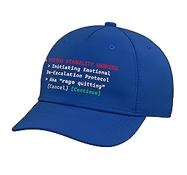 A unique statement that says, "System Stability Warning: Initiating Emotional De-Escalation Protocol. Aka Rage Quitting". A funny computer error prompt meme for gaming frustration. Great for gamer teens, kids, and gamer girls. Classic five-panel structured baseball hat with high-profile crown Adjustable fit; one size fits most adults