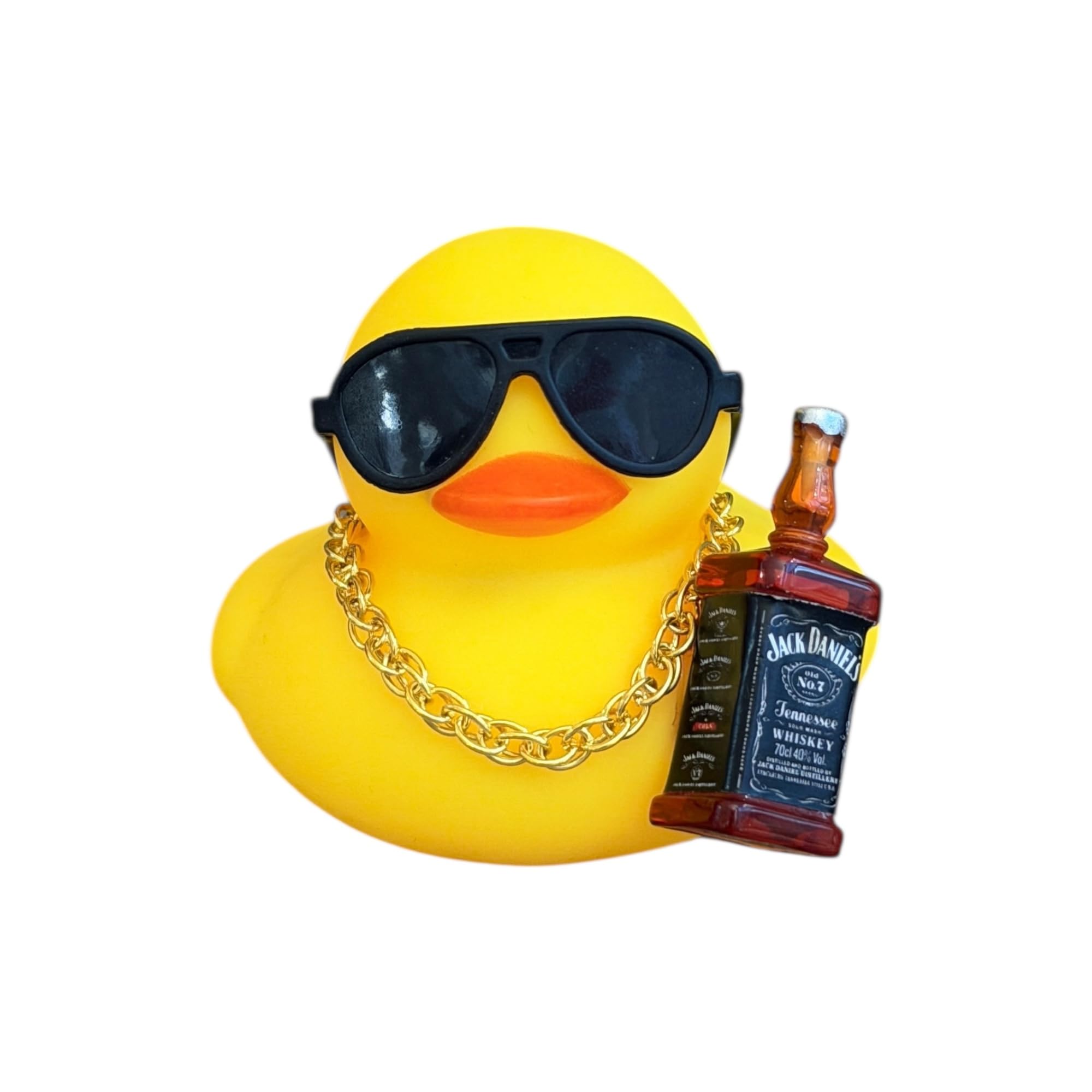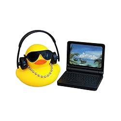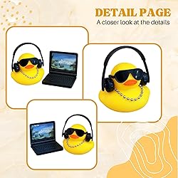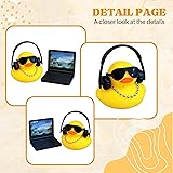 - This vibrant yellow rubber duck figurine features oversized sunglasses, over-ear headphones, and a metallic bead necklace, styled to reflect modern tech culture. It comes with a miniature laptop showcasing a tropical beach screen, perfect for any desk or shelf. A fun nod to the digital lifestyle, this decorative rubber duck adds quirky charm to home decor settings for developers, geeks, and tech lovers.