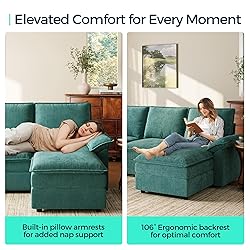 【Comfy Cloud Sectional Couch 】- The cozy cloud couches for living room features upholstered dual layer cushions with high-density, resilient foam and pocket springs to provide a soft cloud-like feeling, making it suitable for entertaining or relaxing 【Ergonomic Comfort & Spine Support】- Fits your spine’s natural curve with a 106° backrest—supports lumbar health for work, gaming, or lounging. Pillow-like armrests ease pressure for all-day comfort, blending lasting support with modern style 【Comfort & Durability Combined】- Made with eco-friendly premium materials, this sectional has a sturdy solid wood frame wrapped in soft, breathable polyester chenille. It feels luxurious and stands up to years of daily use 【Elegant Modern Style】- This plush modular sectional blends modern charm with soft comfort. Its luxurious chenille fabric brings a chic, sophisticated look—perfect for movie nights, lounging, or reading. It fits seamlessly in living rooms, apartments, or any modern home 【Easy Assembly & Hassle-Free Transport】- Shipped in 3 manageable boxes 【May Arrive At Different Date】, this sofa couch is easy to move and can be assembled by one person in just 30 minutes. No stress, just comfort waiting for you to enjoy. If you have any questions, please contact us in time. 【Note: There may be slight color differences due to light or display】