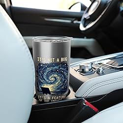 Funny coding humor for anyone who lives in debug mode. Starry Night parody artwork with a laptop and the line Its not a bug its a feature of the universe, perfect for developers who laugh through prod issues, hotfixes, and late night commits. Built for programmers, coders, software engineers, web developers a QA testers, DevOps, sysadmins, IT support, and computer science students. Great for office days, standups, hackathons, code reviews a tech meetup, birthdays, Christmas, and casual Friday. Dual wall insulated: keeps beverages hot or cold Stainless Steel, BPA Free Leak proof lid with clear slider