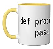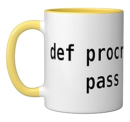 Many people procrastinate, but how would a Python program do that? One way would be to define a procrastinate function that simply passes execution as shown in the piece of code on this funny design for Python programmers. If you enjoy programming in Python and sometimes procrastinate, you may appreciate the subtle humor and give fellow Python programmers among your co-workers and friends a good laugh. 11-ounce ceramic mug is dishwasher and microwave-safe, lead and BPA free Features glossy finish with accent colors on interior, handle, and rim of two-tone designs