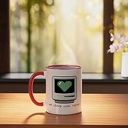 Features a nostalgic 8-bit pixel art design of a computer monitor with a green heart and the classic "Eat. Sleep. Code. Repeat." motto. Perfect for software engineers, web developers, and computer science students who live the coding lifestyle. 11-ounce ceramic mug is dishwasher and microwave-safe, lead and BPA free Features glossy finish with accent colors on interior, handle, and rim of two-tone designs