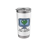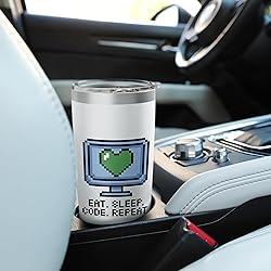 Features a nostalgic 8-bit pixel art design of a computer monitor with a green heart and the classic "Eat. Sleep. Code. Repeat." motto. Perfect for software engineers, web developers, and computer science students who live the coding lifestyle. Dual wall insulated: keeps beverages hot or cold Stainless Steel, BPA Free Leak proof lid with clear slider