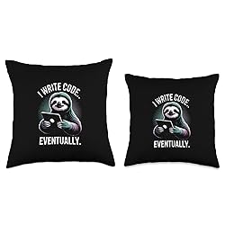 You love coding but you also love taking it slow, and this funny sloth coder theme captures that vibe with the text I WRITE CODE.. EVENTUALLY for every laid back programmer, software developer, or computer science student who debugs at their own pace. Show your sarcastic dev humor at work, in class, or during late night coding sessions when you know you will finish the feature eventually, with a lazy sloth holding a device and the phrase I Write Code Eventually. 100% spun-polyester fabric Double-sided print Filled with 100% polyester and sewn closed Individually cut and sewn by hand Spot clean/dry clean only