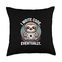 You love coding but you also love taking it slow, and this funny sloth coder theme captures that vibe with the text I WRITE CODE.. EVENTUALLY for every laid back programmer, software developer, or computer science student who debugs at their own pace. Show your sarcastic dev humor at work, in class, or during late night coding sessions when you know you will finish the feature eventually, with a lazy sloth holding a device and the phrase I Write Code Eventually. 100% spun-polyester fabric Double-sided print Filled with 100% polyester and sewn closed Individually cut and sewn by hand Spot clean/dry clean only