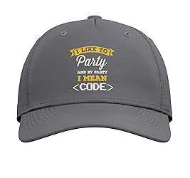 I like to party and by party I mean code Software Developer design, perfect as a great geek gift idea for coding enthusiasts, computer engineers, web developers and computer nerds. Great for the next Hackathon. Classic five-panel structured baseball hat with high-profile crown Adjustable fit; one size fits most adults