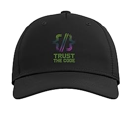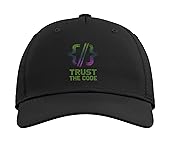 Geometric code bracket illustration in green gradient paired with the phrase “Trust the Code,” expressing logic-driven confidence and developer mindset. Minimal tech design blends programming symbolism with a concise insider quote rooted in coding and systems thinking. Classic five-panel structured baseball hat with high-profile crown Adjustable fit; one size fits most adults