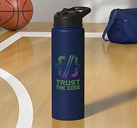 Geometric code bracket illustration in green gradient paired with the phrase “Trust the Code,” expressing logic-driven confidence and developer mindset. Minimal tech design blends programming symbolism with a concise insider quote rooted in coding and systems thinking. Dual-wall insulated stainless steel construction keeps beverages hot or cold, dishwasher safe and BPA free Leak-proof flip lid includes BPA free plastic drinking straw