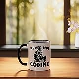 This design makes a great birthday or christmas present. Then this is made for you as a developer. Programming and Software Engineering are your passion? This design reads: "Never Not Coding". Makes a perfect surprise for any programmer, computer software engineer, developer, coder out there. 11-ounce ceramic mug is dishwasher and microwave-safe, lead and BPA free Features glossy finish with accent colors on interior, handle, and rim of two-tone designs