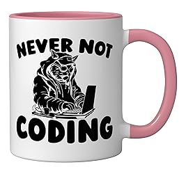 This design makes a great birthday or christmas present. Then this is made for you as a developer. Programming and Software Engineering are your passion? This design reads: "Never Not Coding". Makes a perfect surprise for any programmer, computer software engineer, developer, coder out there. 11-ounce ceramic mug is dishwasher and microwave-safe, lead and BPA free Features glossy finish with accent colors on interior, handle, and rim of two-tone designs