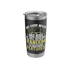 Imaginative present on the topic programming. Related search words are computer, coding and software. Nice grafic for Computer Fans and Internet Nerds with the title: My Code Never Has Bugs, It Just Develops Random Unexpected Features. The language of computers consists of 1 and 0, not everyone can tell the PC what to do. It is not easy to program the so called software, for that you have to be almost a nerd. Games or software have programmed databases. Dual wall insulated: keeps beverages hot or cold Stainless Steel, BPA Free Leak proof lid with clear slider