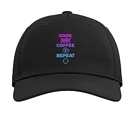 This coding-themed design features the popular phrase "Code Coffee Repeat" with colorful icons, perfect for developers, programmers, software engineers, and tech lovers who live the daily grind of coding and caffeine. Great for dad, mom, brother, sister, coworker, or any family member who loves code and coffee. Ideal for holidays like Christmas, Father's Day, or Programmer’s Day. Classic five-panel structured baseball hat with high-profile crown Adjustable fit; one size fits most adults